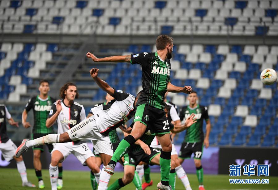 7月15日,尤文图斯队球员桑德罗(前左)头球破门。 当日,在2019-2020赛季意大利足球甲级联赛第33轮比赛中,尤文图斯队客场以3比3战平萨索洛队。 新华社发(阿尔贝托·林格利亚摄)