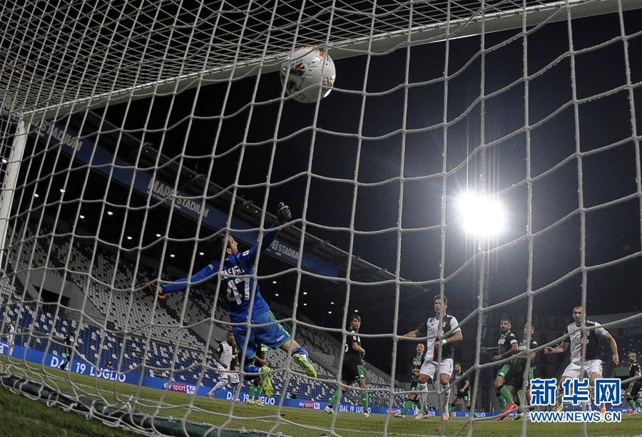 7月15日,萨索洛队守门员孔西利(上)未能扑救出尤文图斯队球员达尼洛的射门。 当日,在2019-2020赛季意大利足球甲级联赛第33轮比赛中,尤文图斯队客场以3比3战平萨索洛队。 新华社发(阿尔贝托·林格利亚摄)