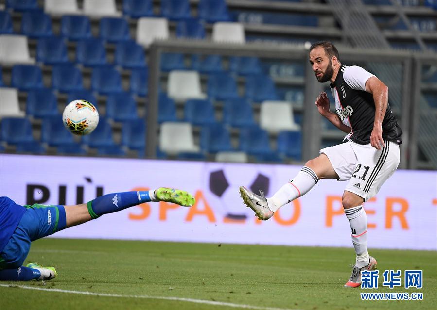 7月15日,尤文图斯队球员伊瓜因(右)在比赛中射门得分。 当日,在2019-2020赛季意大利足球甲级联赛第33轮比赛中,尤文图斯队客场以3比3战平萨索洛队。 新华社发(阿尔贝托·林格利亚摄)