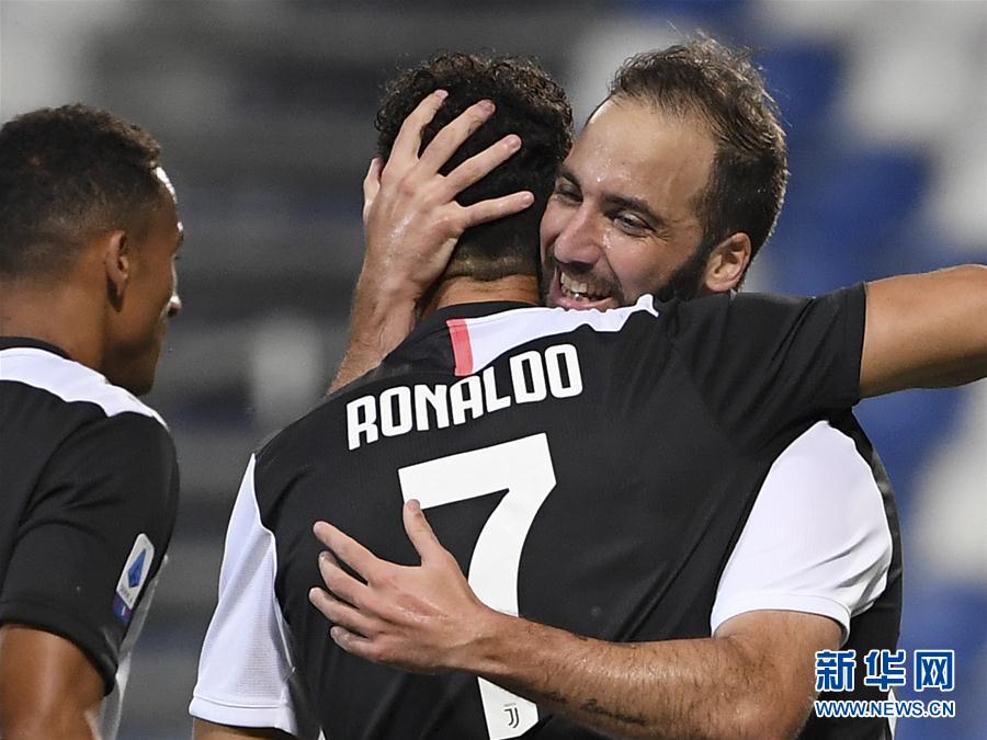 7月15日,尤文图斯队球员伊瓜因(右)进球后与队友克·罗纳尔多拥抱庆祝。 当日,在2019-2020赛季意大利足球甲级联赛第33轮比赛中,尤文图斯队客场以3比3战平萨索洛队。 新华社发(阿尔贝托·林格利亚摄)