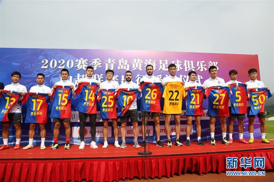 7月16日,青岛黄海青港队球员在出征仪式上展示2020赛季球队主场队服。 当日,青岛黄海青港队举行中超联赛出征授旗仪式并展示2020赛季球队主场队服。青岛黄海青港队于2019赛季夺得中甲联赛冠军升入中超,将在7月25日中超联赛第一阶段苏州赛区的第一场比赛中对阵武汉卓尔队。 新华社记者 李紫恒 摄