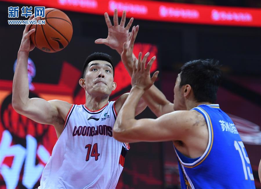 7月16日,时代中国广州队球员郭凯(左)在比赛中进攻。 当日,在山东青岛举行的2019-2020赛季中国男子篮球职业联赛(CBA)复赛第二阶段(红岛赛区)比赛中,时代中国广州队以107比100战胜苏州肯帝亚队。 新华社记者 朱峥 摄