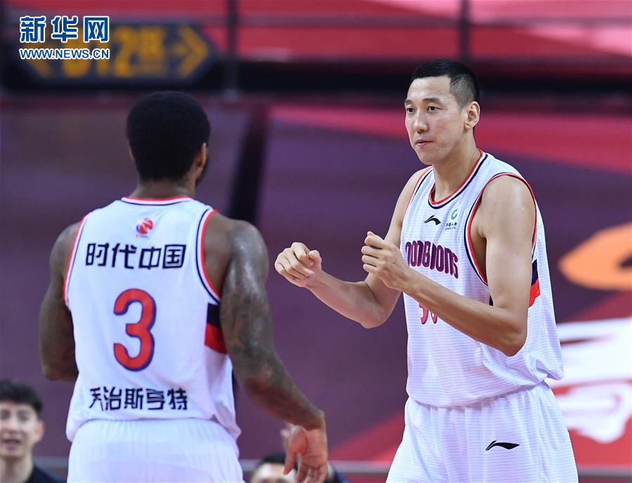 7月16日,时代中国广州队球员郑准(右)在比赛中庆祝得分。 当日,在山东青岛举行的2019-2020赛季中国男子篮球职业联赛(CBA)复赛第二阶段(红岛赛区)比赛中,时代中国广州队以107比100战胜苏州肯帝亚队。 新华社记者 朱峥 摄