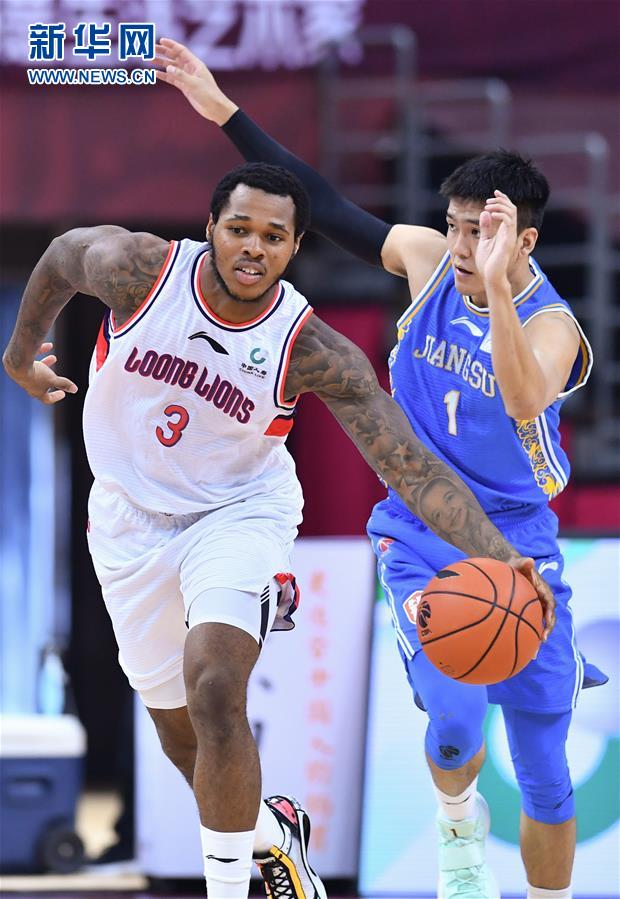 7月16日,时代中国广州队球员亨特(左)在比赛中运球。 当日,在山东青岛举行的2019-2020赛季中国男子篮球职业联赛(CBA)复赛第二阶段(红岛赛区)比赛中,时代中国广州队对阵苏州肯帝亚队。 新华社记者 朱峥 摄