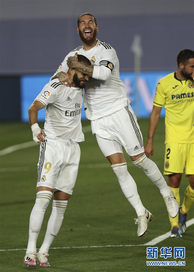 7月16日,皇家马德里队球员本泽马(左)进球后与队友拉莫斯庆祝。 当日,在2019-2020赛季西班牙足球甲级联赛第37轮的比赛中,皇家马德里队主场以2比1战胜比利亚雷亚尔队,提前一轮获得本赛季西甲联赛冠军。 新华社发(爱德华·皮特斯摄)