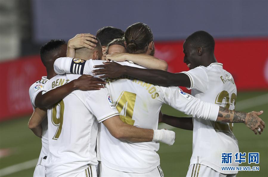7月16日,皇家马德里队球员本泽马(左二)进球后与队友庆祝。 当日,在2019-2020赛季西班牙足球甲级联赛第37轮的比赛中,皇家马德里队主场以2比1战胜比利亚雷亚尔队,提前一轮获得本赛季西甲联赛冠军。 新华社发(爱德华·皮特斯摄)