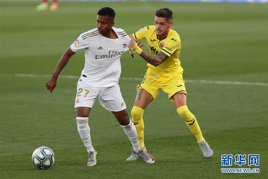 7月16日,皇家马德里队球员罗德里戈(左)与比利亚雷亚尔队球员金蒂利亚在比赛中拼抢。 当日,在2019-2020赛季西班牙足球甲级联赛第37轮的比赛中,皇家马德里队主场以2比1战胜比利亚雷亚尔队,提前一轮获得本赛季西甲联赛冠军。 新华社发(爱德华·皮特斯摄)