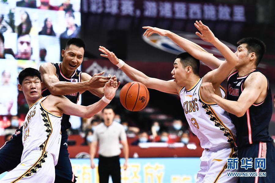 7月16日,广东东莞银行队球员易建联(左二)在比赛中与浙江广厦控股队球员胡金秋(左一)、朱俊龙(右二)拼抢。 当日,在山东青岛举行的2019-2020赛季中国男子篮球职业联赛(CBA)复赛第二阶段(崂山赛区)比赛中,广东东莞银行队以104比97战胜浙江广厦控股队。 新华社记者 郭绪雷 摄