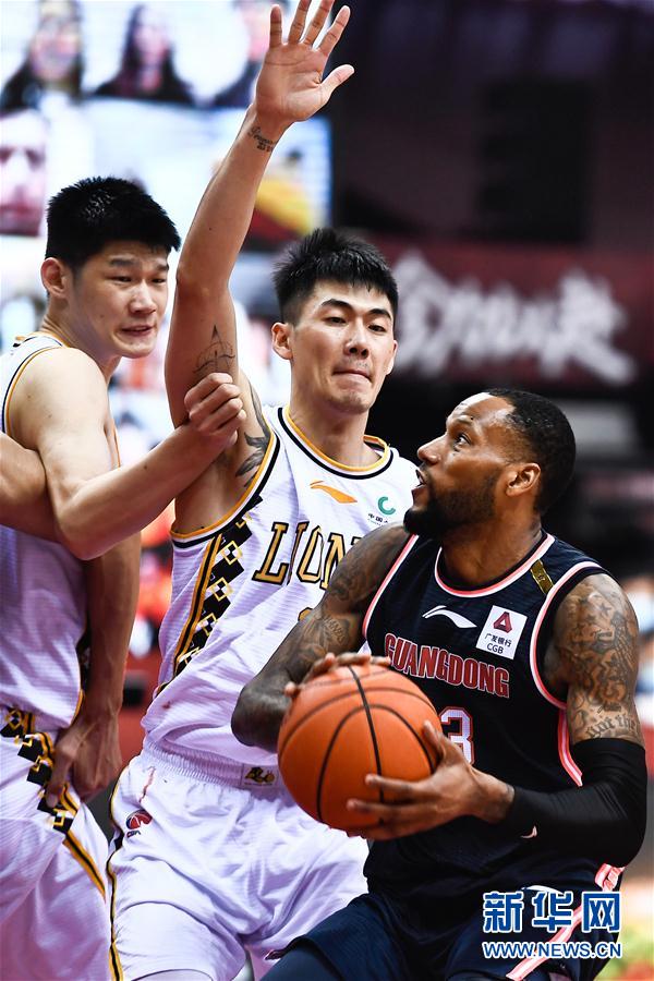 7月16日,广东东莞银行队球员威姆斯(右)在比赛中进攻。 当日,在山东青岛举行的2019-2020赛季中国男子篮球职业联赛(CBA)复赛第二阶段(崂山赛区)比赛中,广东东莞银行队以104比97战胜浙江广厦控股队。 新华社记者 郭绪雷 摄