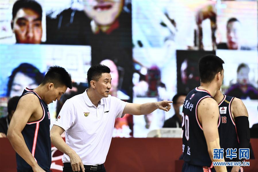 7月16日,广东东莞银行队主教练杜锋(左二)在场边指挥。 当日,在山东青岛举行的2019-2020赛季中国男子篮球职业联赛(CBA)复赛第二阶段(崂山赛区)比赛中,广东东莞银行队以104比97战胜浙江广厦控股队。 新华社记者 郭绪雷 摄