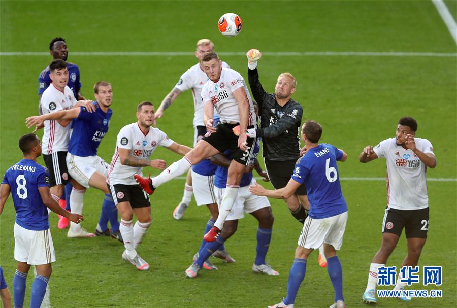 7月16日,莱斯特城队守门员卡斯帕·舒梅切尔(右三)在比赛中扑救。 当日,在2019-2020赛季英格兰足球超级联赛第36轮比赛中,莱斯特城队主场以2比0战胜谢菲尔德联队。 新华社/路透