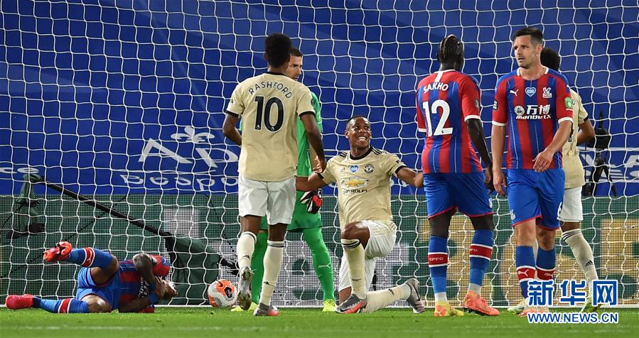 7月16日,曼联队球员马夏尔(中)在进球后庆祝。 当日,在2019-2020赛季英格兰足球超级联赛第36轮比赛中,曼联队客场以2比0战胜水晶宫队。 新华社/路透