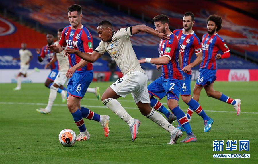 7月16日,曼联队球员马夏尔(左二)在比赛中带球进攻。 当日,在2019-2020赛季英格兰足球超级联赛第36轮比赛中,曼联队客场以2比0战胜水晶宫队。 新华社/路透