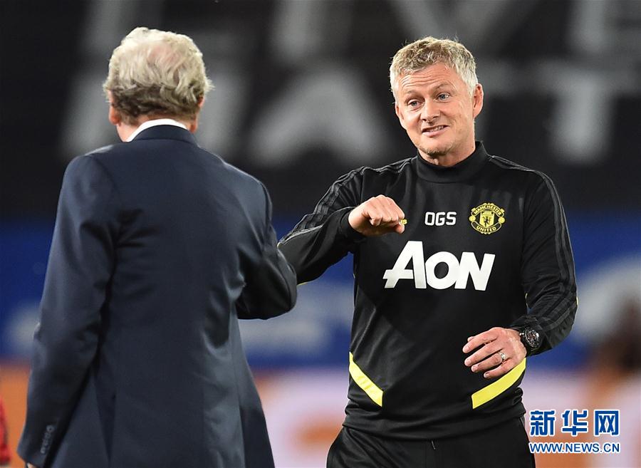7月16日,曼联队主教练索尔斯克亚(右)在赛后和水晶宫队主教练霍奇森致意。 当日,在2019-2020赛季英格兰足球超级联赛第36轮比赛中,曼联队客场以2比0战胜水晶宫队。 新华社/路透