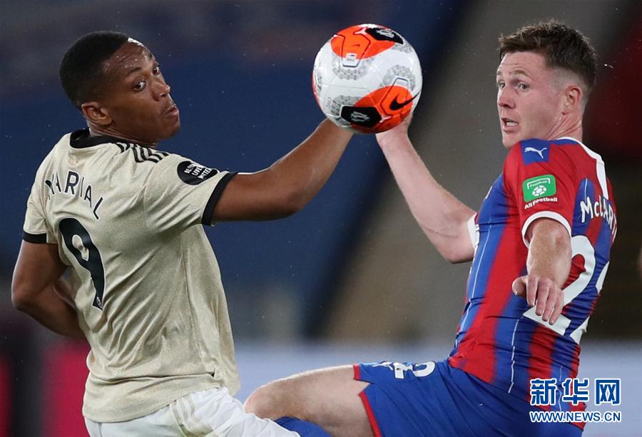 7月16日,曼联队球员马夏尔(左)在比赛中和水晶宫队球员麦卡锡拼抢。 当日,在2019-2020赛季英格兰足球超级联赛第36轮比赛中,曼联队客场以2比0战胜水晶宫队。 新华社/路透