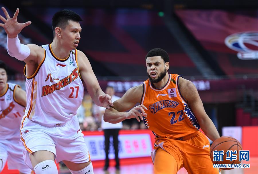 7月17日,上海久事队球员麦卡勒姆(右)在比赛中带球突破八一南昌队球员许钟豪。 当日,在山东青岛举行的2019-2020赛季中国男子篮球职业联赛(CBA)复赛第二阶段(红岛赛区)比赛中,上海久事队以97比90战胜八一南昌队。 新华社记者 朱峥 摄