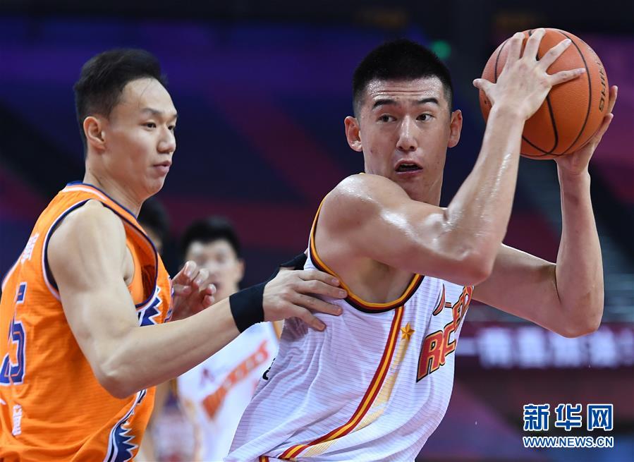 7月17日,八一南昌队球员付豪(右)在比赛中持球进攻。 当日,在山东青岛举行的2019-2020赛季中国男子篮球职业联赛(CBA)复赛第二阶段(红岛赛区)比赛中,八一南昌队对阵上海久事队。 新华社记者朱峥摄
