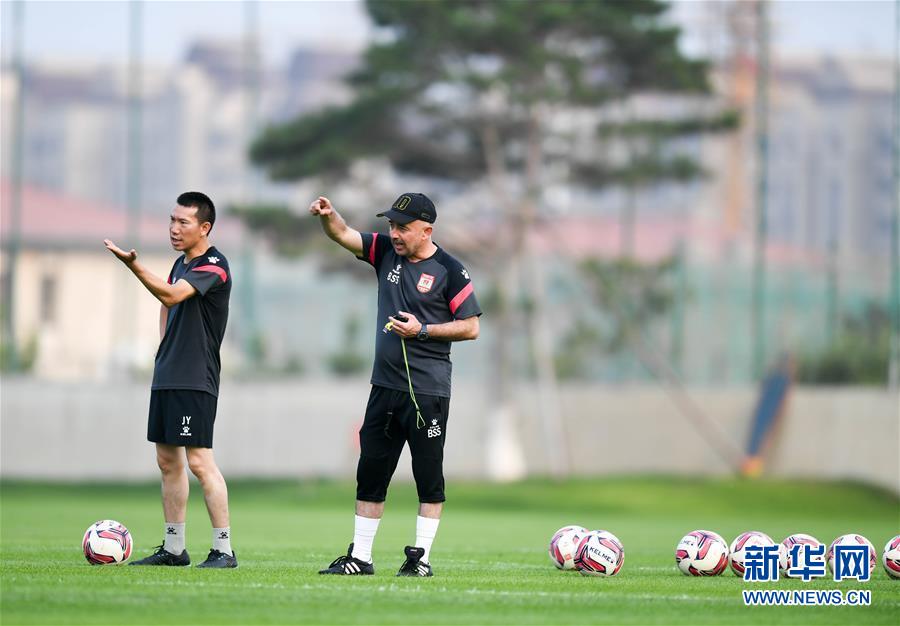 7月17日,长春亚泰队主教练巴巴扬(右)在训练中指导。 当日,长春亚泰足球队在长春亚泰净月基地进行训练,为新赛季中甲联赛做准备。 新华社发(颜麟蕴摄)