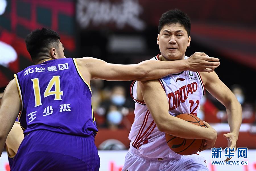 7月17日,北京控股队球员王少杰(左)在比赛中防守青岛国信双星队球员王庆明。 当日,在山东青岛举行的2019-2020赛季中国男子篮球职业联赛(CBA)复赛第二阶段(崂山赛区)比赛中,青岛国信双星队迎战北京控股队。 新华社记者 郭绪雷 摄