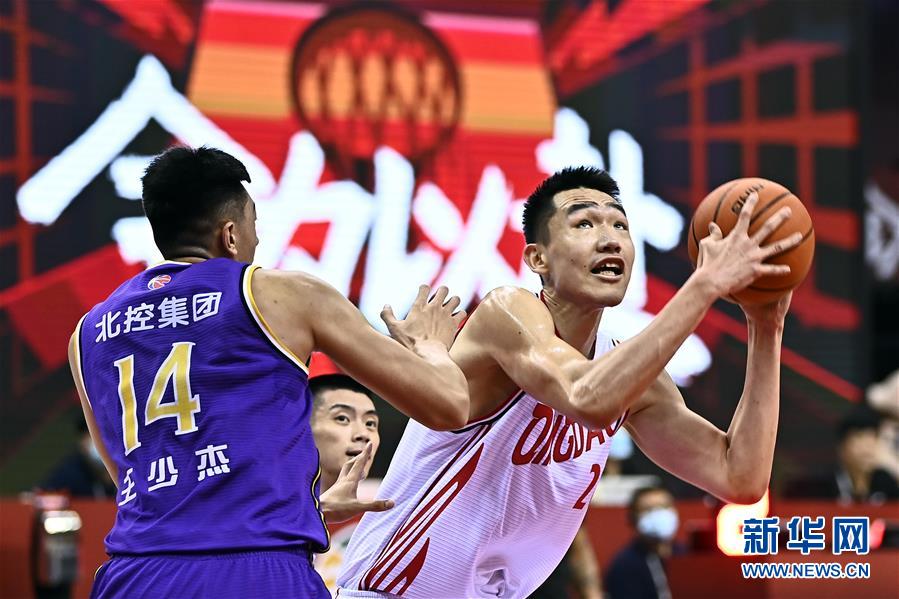 7月17日,青岛国信双星队球员赵戌宏(右)在比赛中进攻。 当日,在山东青岛举行的2019-2020赛季中国男子篮球职业联赛(CBA)复赛第二阶段(崂山赛区)比赛中,青岛国信双星队迎战北京控股队。 新华社记者 郭绪雷 摄