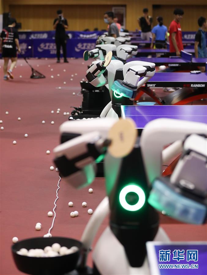 这是7月17日拍摄的乒乓球机器人。 当日,上海体育学院中国乒乓球学院参与研发的乒乓球机器人与该学院少年班学员进行了一场“人机对战”展示活动。据介绍,该款乒乓球机器人旨在帮助乒乓球训练变得智能化,未来将有助于乒乓球运动的训练和推广。 新华社记者 丁汀 摄