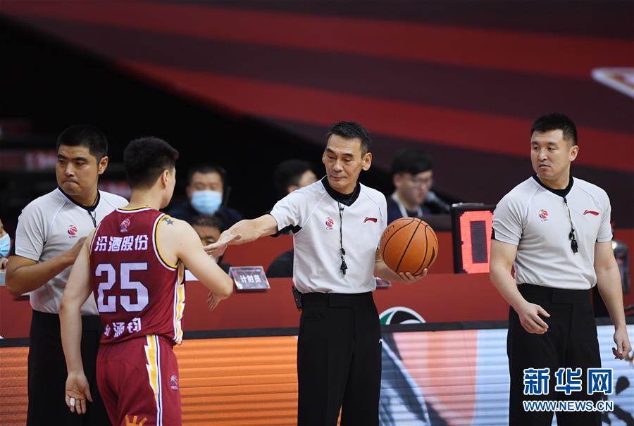 7月18日,本场比赛第一副裁判张磊(左一)、主裁判梁斌(右二)、第二副裁判杨晓光(右一)与山西汾酒股份队球员张涵钧致意。 当日,在山东青岛举行的2019-2020赛季中国男子篮球职业联赛(CBA)复赛第二阶段(崂山赛区)比赛中,浙江稠州银行队以90比74战胜山西汾酒股份队。 新华社记者 李紫恒 摄