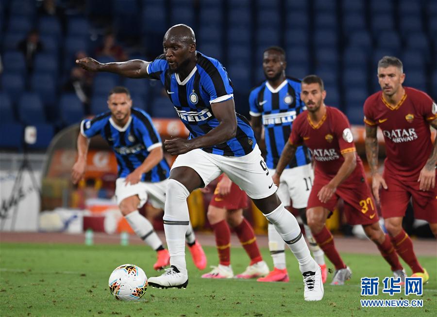 7月19日,国际米兰队球员卢卡库(前)罚中点球。 当日,在意大利罗马进行的2019-2020赛季意大利足球甲级联赛第34轮比赛中,罗马队主场以2比2战平国际米兰队。 新华社发(奥古斯托·卡萨索利摄)