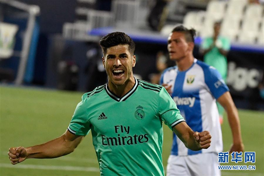 7月19日,皇马队球员阿森西奥庆祝进球。 当日,在2019-2020赛季西班牙足球甲级联赛第38轮比赛中,皇家马德里队客场以2比2战平莱加内斯队。西甲联赛本赛季收官,皇家马德里队获得本赛季冠军,莱加内斯队降级。 新华社/法新