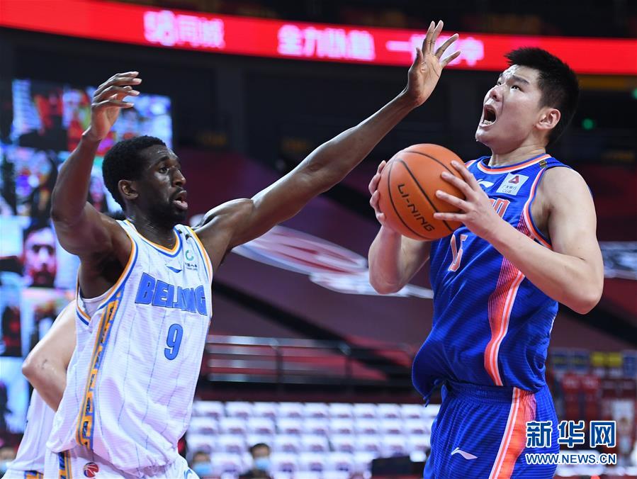 7月20日,四川五粮金樽队球员袁振梁(右)突破北京首钢队球员尤度的防守。 当日,在山东青岛举行的2019-2020赛季中国男子篮球职业联赛(CBA)复赛第二阶段(红岛赛区)比赛中,北京首钢队以84比73战胜四川五粮金樽队。 新华社记者 朱峥 摄