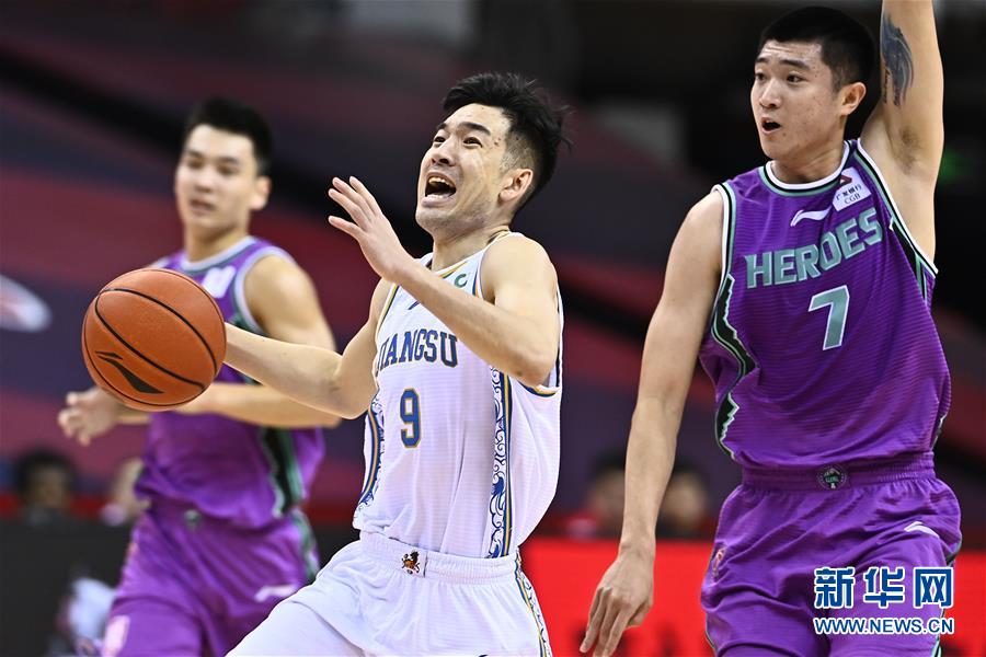 7月20日,苏州肯帝亚队球员王洪(中)在比赛中带球进攻。 当日,在山东青岛举行的2019-2020赛季中国男子篮球职业联赛(CBA)复赛第二阶段(崂山赛区)比赛中,苏州肯帝亚队迎战山东西王队。 新华社记者郭绪雷摄
