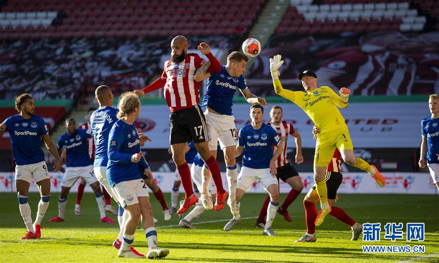 7月20日,埃弗顿队门将皮克福德(上右)、球员迪涅(上中)与谢菲尔德联队球员麦戈德里克(上左)在门前拼抢。 当日,在2019-2020赛季英格兰足球超级联赛第37轮比赛中,埃弗顿队客场以1比0战胜谢菲尔德联队。 新华社发