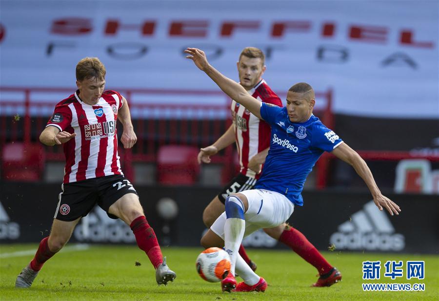 7月20日,埃弗顿队球员里沙利松(右)与谢菲尔德联队球员奥斯本(左)在比赛中拼抢。 当日,在2019-2020赛季英格兰足球超级联赛第37轮比赛中,埃弗顿队客场以1比0战胜谢菲尔德联队。 新华社发