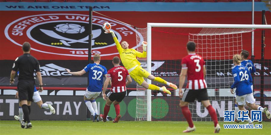 7月20日,埃弗顿队门将皮克福德(中)在门前扑救。 当日,在2019-2020赛季英格兰足球超级联赛第37轮比赛中,埃弗顿队客场以1比0战胜谢菲尔德联队。 新华社发