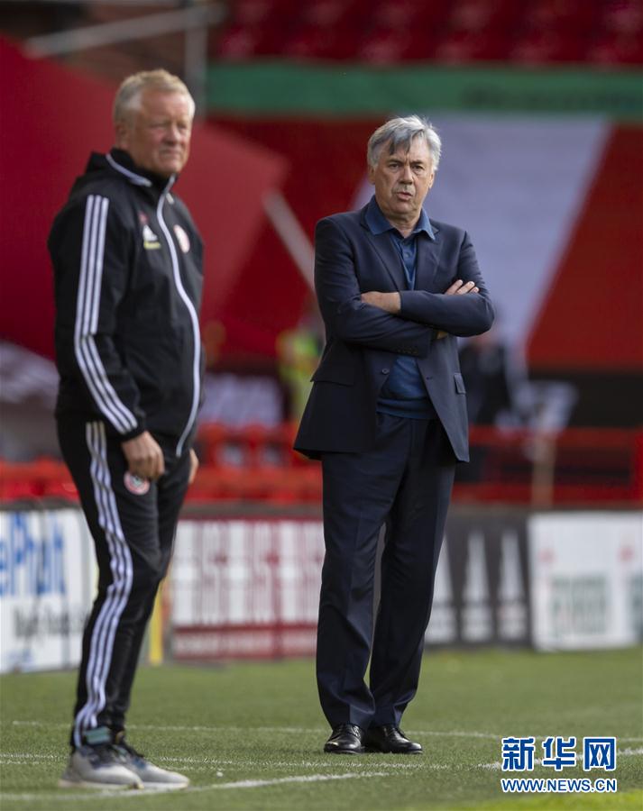 7月20日,埃弗顿队主帅安切洛蒂(右)与谢菲尔德联队主帅怀尔德在场边观战。 当日,在2019-2020赛季英格兰足球超级联赛第37轮比赛中,埃弗顿队客场以1比0战胜谢菲尔德联队。 新华社发