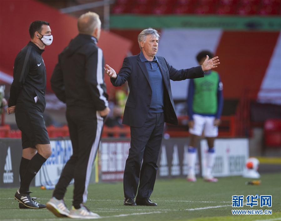 7月20日,埃弗顿队主帅安切洛蒂(右)在场边指挥。 当日,在2019-2020赛季英格兰足球超级联赛第37轮比赛中,埃弗顿队客场以1比0战胜谢菲尔德联队。 新华社发