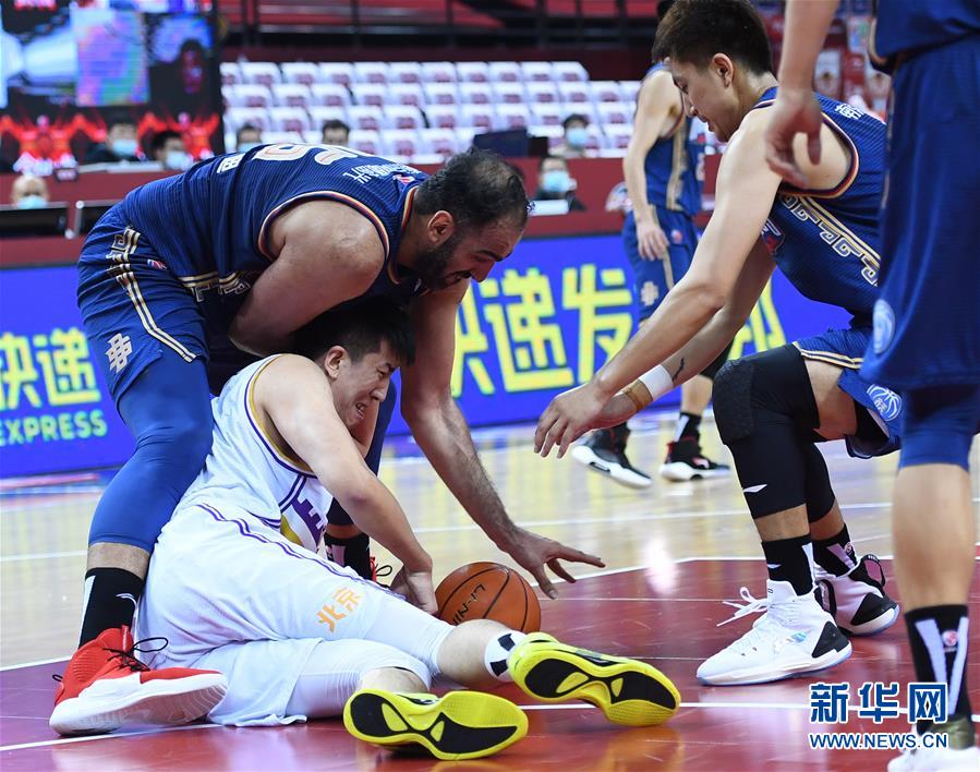 7月21日,北京控股队球员宗赞(左下)在比赛中与南京同曦宙光队球员哈达迪(左上)争球。 当日,在山东青岛举行的2019-2020赛季中国男子篮球职业联赛(CBA)复赛第二阶段(红岛赛区)比赛中,北京控股队以110比108战胜南京同曦宙光队。 新华社记者朱峥摄