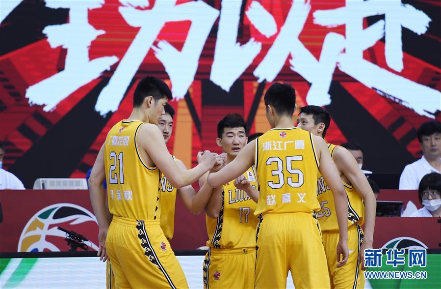 7月21日,浙江广厦控股队首发球员在开赛前相互鼓励。 当日,在山东青岛举行的2019-2020赛季中国男子篮球职业联赛(CBA)复赛第二阶段(崂山赛区)比赛中,天津先行者队迎战浙江广厦控股队。 新华社记者李紫恒摄