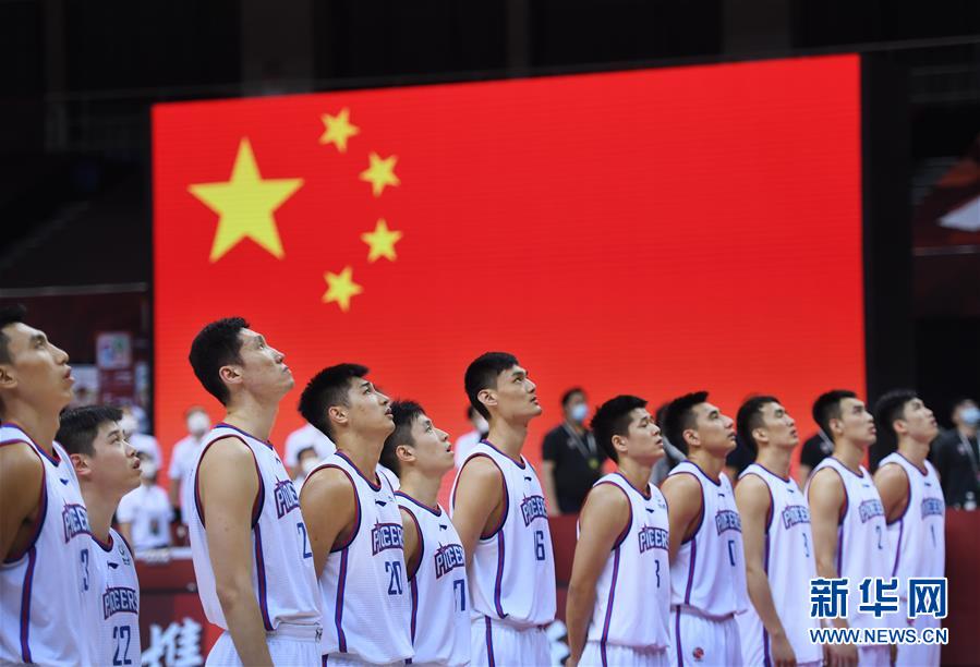 7月21日,天津先行者队球员在升旗仪式上。 当日,在山东青岛举行的2019-2020赛季中国男子篮球职业联赛(CBA)复赛第二阶段(崂山赛区)比赛中,天津先行者队迎战浙江广厦控股队。 新华社记者李紫恒摄