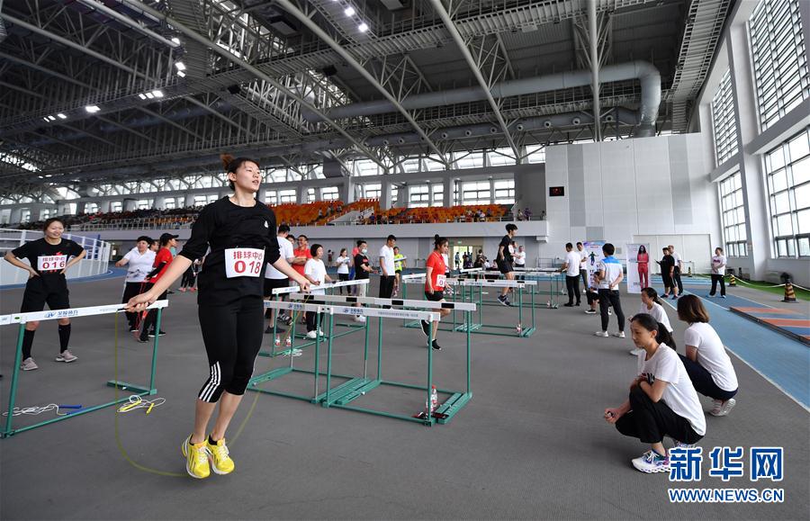 7月21日,排球中心运动员王艺竹(左前)在参加定时跳绳竞赛。 当日,天津市体育局优秀运动队体能大比武在团泊体育中心顺利进行,来自田径中心、举摔柔拳跆中心、排球中心等9个天津市体育局下属运动管理中心的约90位运动员,参加卧推、垂直纵跳、定时跳绳、3000米计时、30米计时的竞赛。据了解,此次体能大比武是为了集中检验疫情期间的封闭训练成果,更为有针对性地开展奥运会、全运会备战工作打下体能基础。 新华社记者 李然 摄