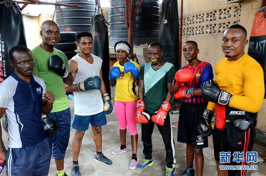 7月20日,在坦桑尼亚达累斯萨拉姆,21岁的女拳击手杰西卡·姆菲南加(右四)和队友在一家拳击俱乐部内合影。 (配本社同题文字稿) 新华社发