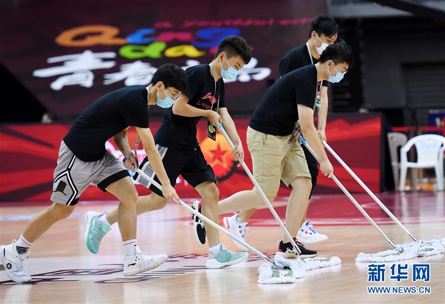 7月21日,工作人员在比赛暂停间歇拖地。 当日,在山东青岛举行的2019-2020赛季中国男子篮球职业联赛(CBA)复赛第二阶段(崂山赛区)比赛中,浙江广厦控股队以125比93战胜天津先行者队。 新华社记者李紫恒摄