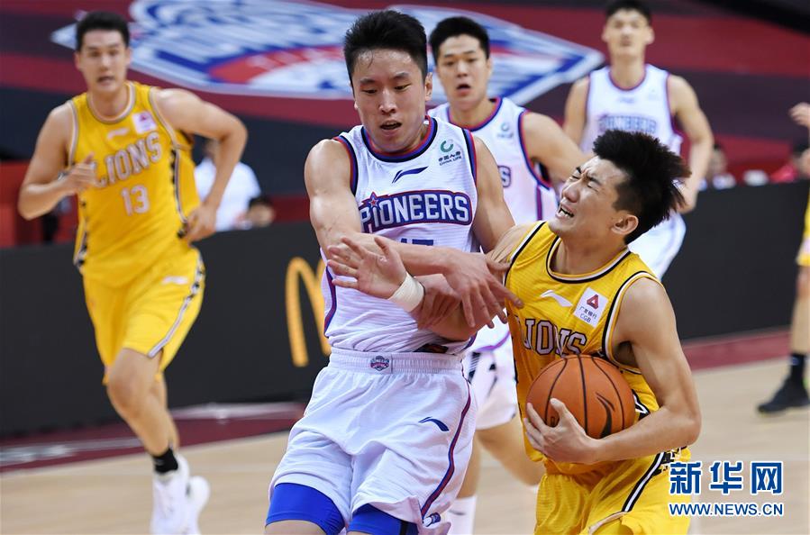 7月21日,天津先行者队球员田野(左二)在比赛中防守浙江广厦控股队球员孙铭徽进攻。 当日,在山东青岛举行的2019-2020赛季中国男子篮球职业联赛(CBA)复赛第二阶段(崂山赛区)比赛中,浙江广厦控股队以125比93战胜天津先行者队。 新华社记者李紫恒摄