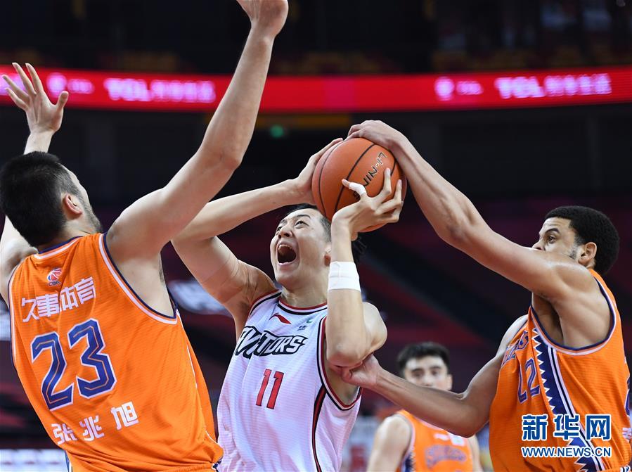 7月21日,深圳马可波罗队球员沈梓捷(中)在比赛中突破。 当日,在山东青岛举行的2019-2020赛季中国男子篮球职业联赛(CBA)复赛第二阶段(红岛赛区)比赛中,上海久事队以107比93战胜深圳马可波罗队。 新华社记者朱峥摄