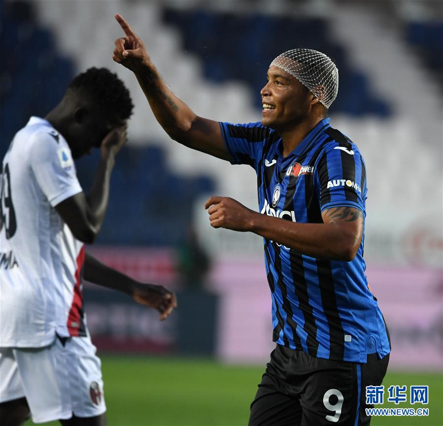 7月21日,亚特兰大队球员穆里尔(右)在比赛中庆祝进球。 当日,在意大利贝加莫进行的2019-2020赛季意大利足球甲级联赛第35轮比赛中,亚特兰大队主场以1比0战胜博洛尼亚队。 新华社发