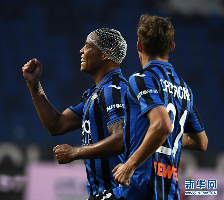 7月21日,亚特兰大队球员穆里尔(左)在比赛中庆祝进球。 当日,在意大利贝加莫进行的2019-2020赛季意大利足球甲级联赛第35轮比赛中,亚特兰大队主场以1比0战胜博洛尼亚队。 新华社发