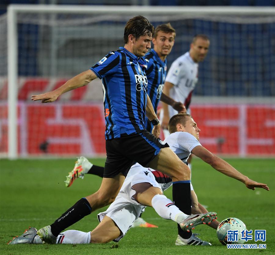 7月21日,亚特兰大队球员德容恩(左前)在比赛中与博洛尼亚队球员斯万贝里(下)拼抢。 当日,在意大利贝加莫进行的2019-2020赛季意大利足球甲级联赛第35轮比赛中,亚特兰大队主场以1比0战胜博洛尼亚队。 新华社发