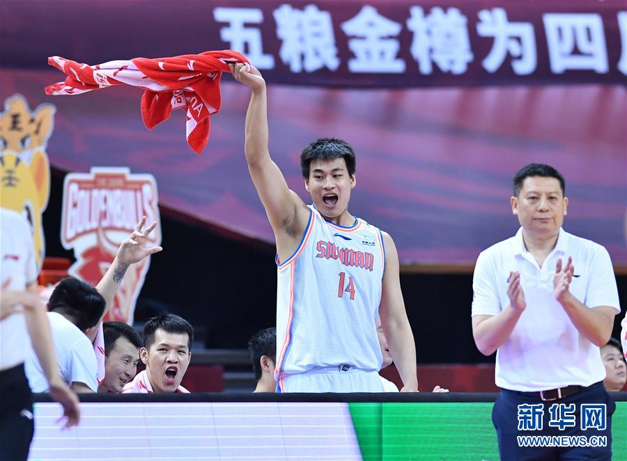 7月22日,四川五粮金樽队球员侯天一(中)在庆祝得分。 当日,在山东青岛举行的2019-2020赛季中国男子篮球职业联赛(CBA)复赛第二阶段(红岛赛区)比赛中,四川五粮金樽队以101比84战胜八一南昌队。 新华社记者 朱峥 摄