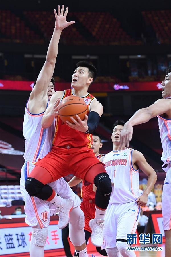 7月22日,八一南昌队球员田宇翔(左二)在比赛中突破上篮。 当日,在山东青岛举行的2019-2020赛季中国男子篮球职业联赛(CBA)复赛第二阶段(红岛赛区)比赛中,四川五粮金樽队以101比84战胜八一南昌队。 新华社记者 朱峥 摄