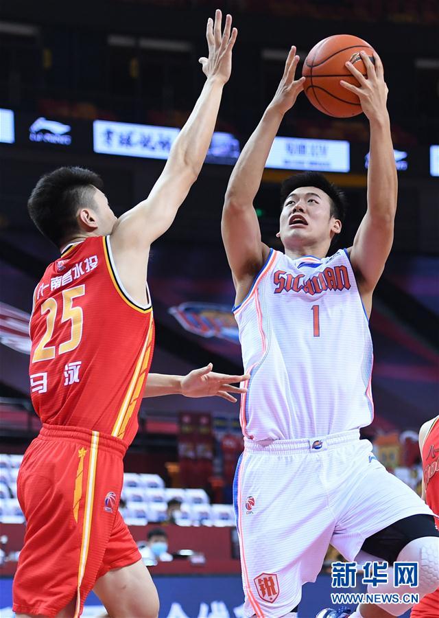 7月22日,四川五粮金樽队球员景菡一(右)在比赛中上篮。 当日,在山东青岛举行的2019-2020赛季中国男子篮球职业联赛(CBA)复赛第二阶段(红岛赛区)比赛中,四川五粮金樽队以101比84战胜八一南昌队。 新华社记者 朱峥 摄