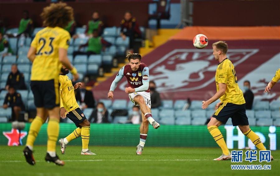 7月21日,阿斯顿维拉队球员格拉利什(右二)在比赛中射门。 当日,在2019-2020赛季英格兰足球超级联赛第37轮比赛中,阿斯顿维拉队主场以1比0战胜阿森纳队。 新华社/路透